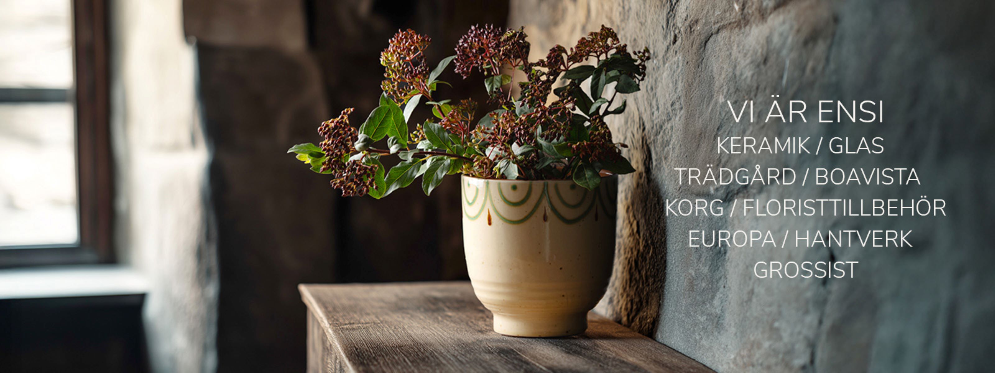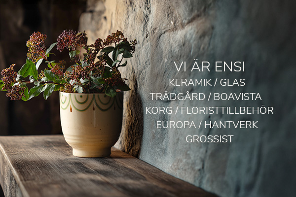 keramik, glas, korg, zink, lerkrukor och binderiartiklar. Våra kunder är återförsäljare inom blomster-, styling-, konfektyr- och presentbranschen.
