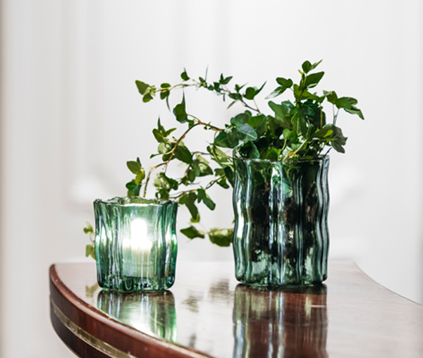 Glasserien Arvid har en modern touch med sina böljande former. Ett kvalitetsglas som kan användas både som vas och lykta och som finns i tre storlekar och två färger