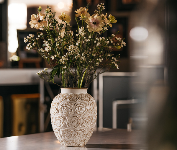 En serie med krukor och vas med dekorativt rosmösnster Serien finns i två färger, creme och grönt.