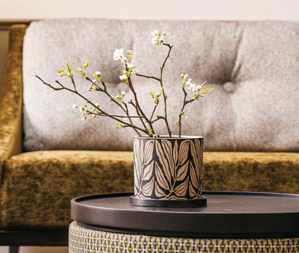 Sonja är en cylinderformad kruka med fat som har ett upphöjt dekorativt mönster av blad i relief.